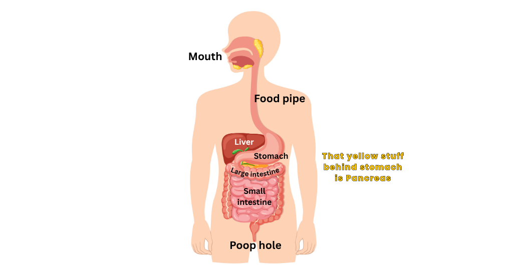 Digestive system = A tube originating from mouth to poop hole includes stomach, small intestine and large intestine + God level organs like liver, pancreas and spleen